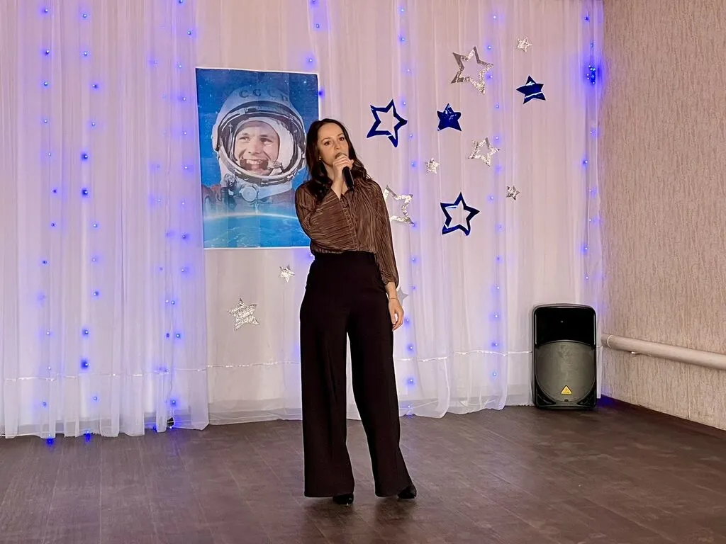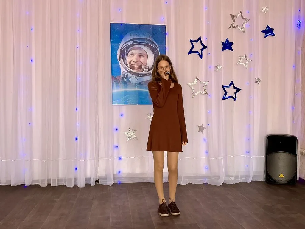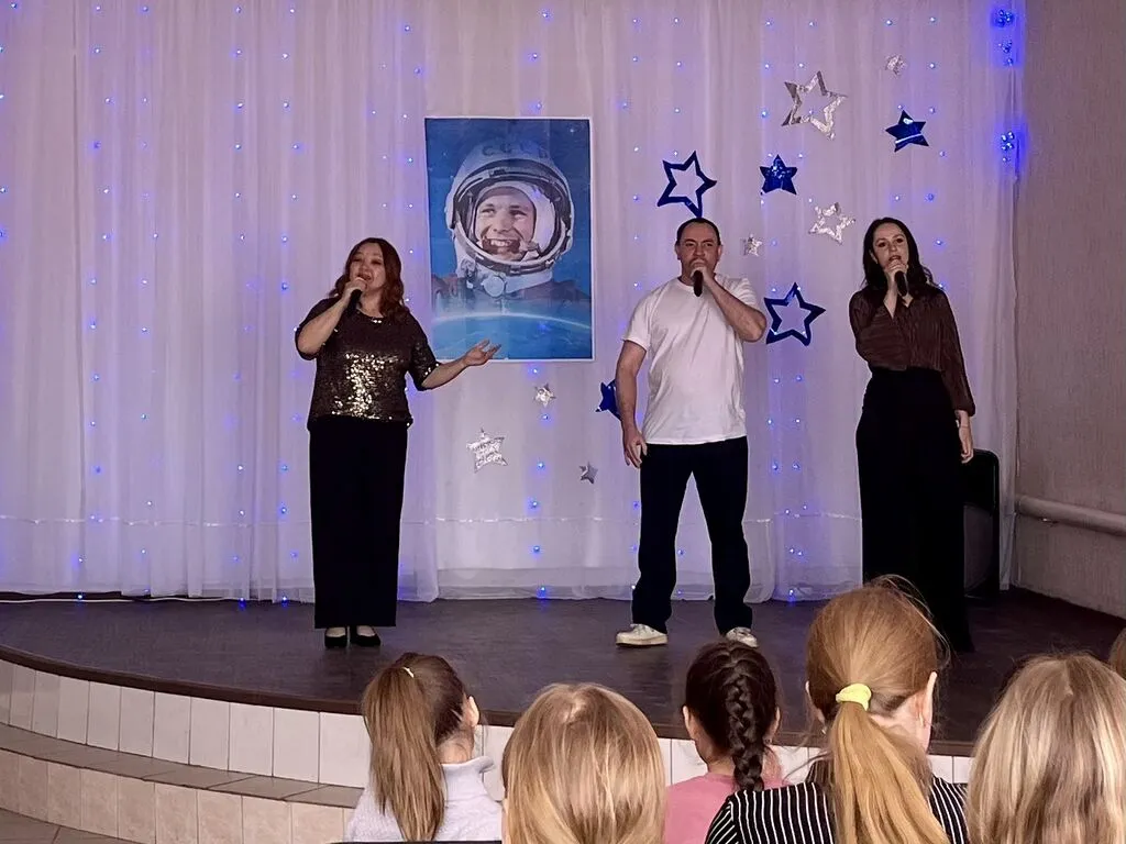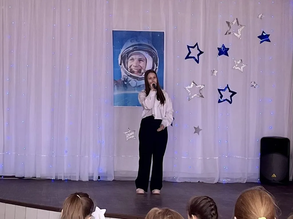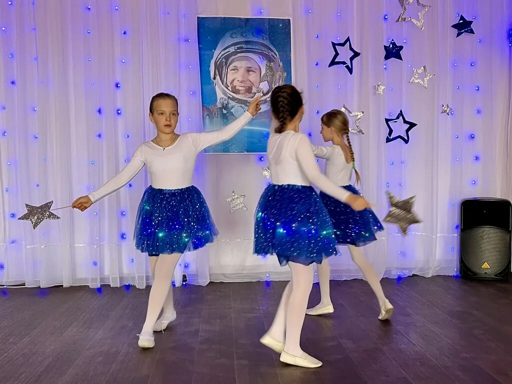 Советник директора по воспитанию прочла стихотворение «Созвездие Гагарина», все вместе мы пели «Траву у дома», «Нежность», легендарную «Надежду» и другие «космические» песни. Танцевальный коллектив «Веселый каблучок» подарил зрителям «Звездный танец».
