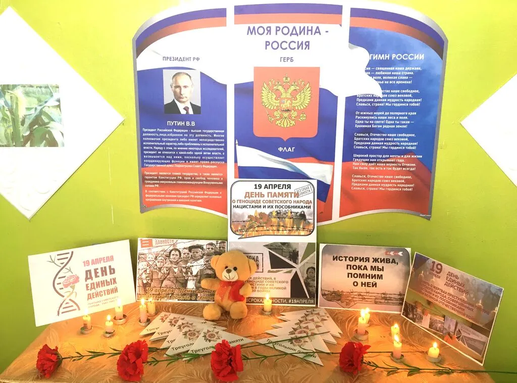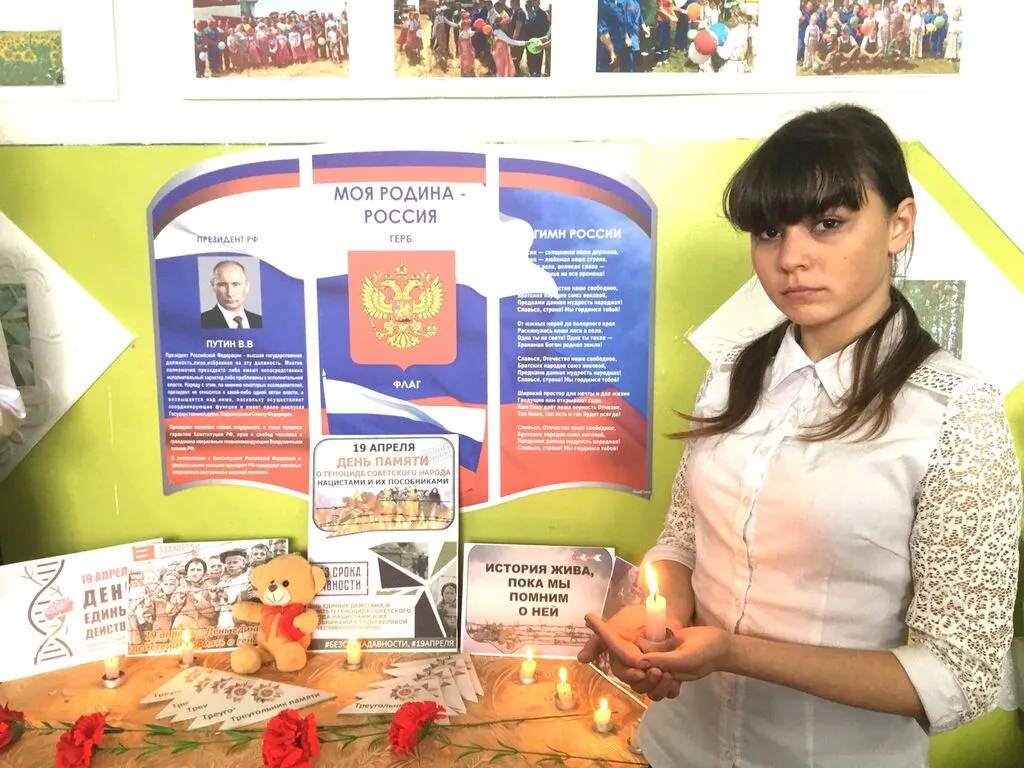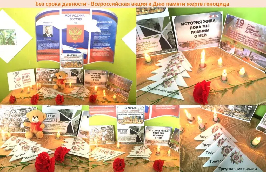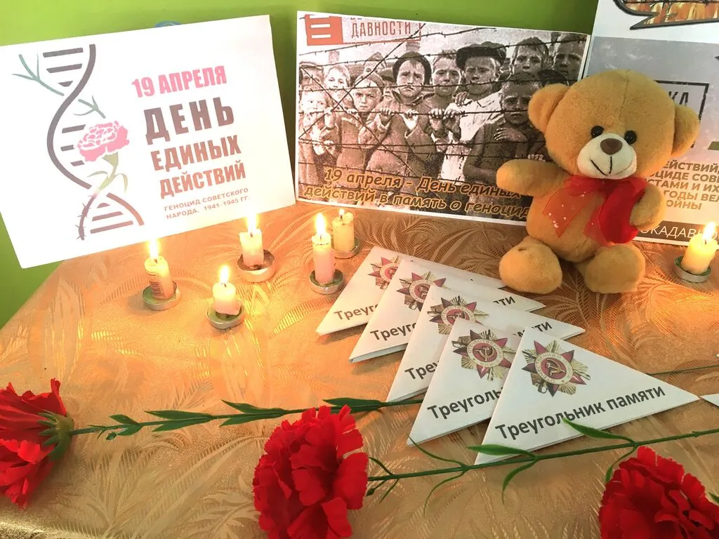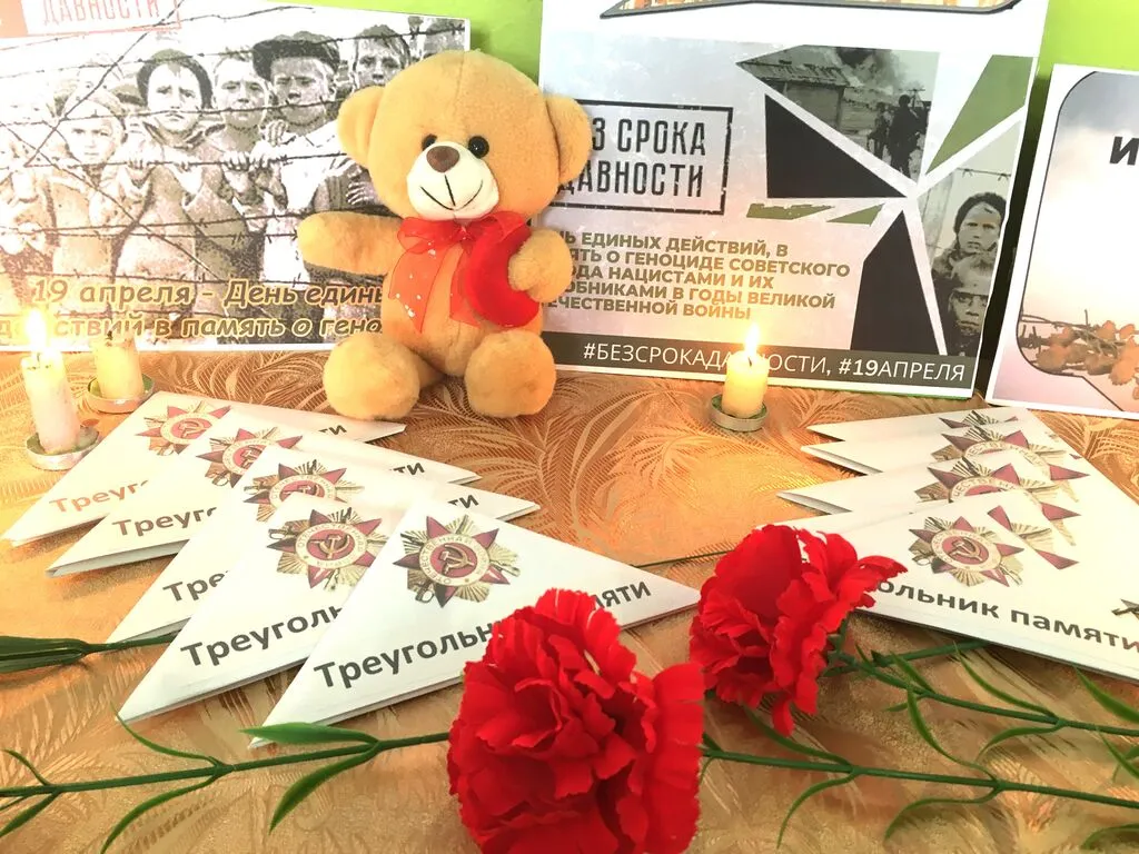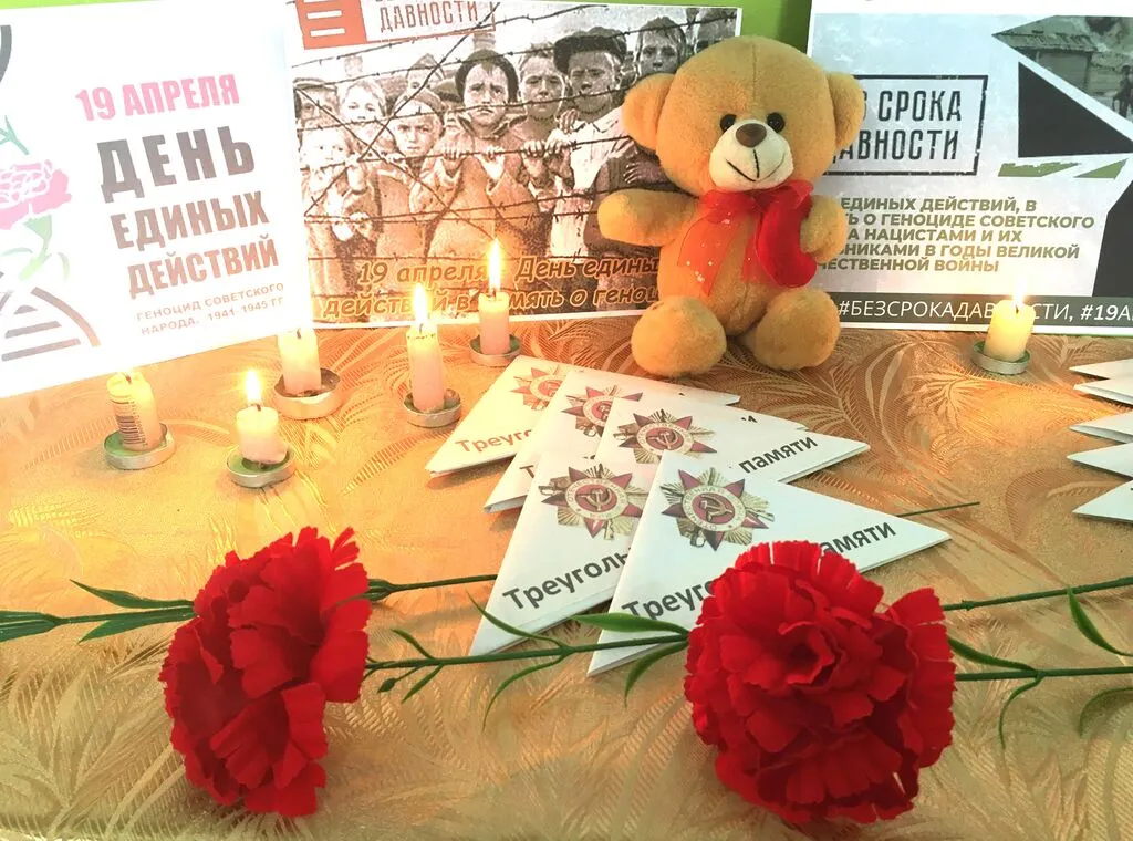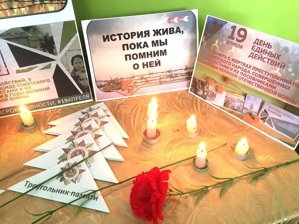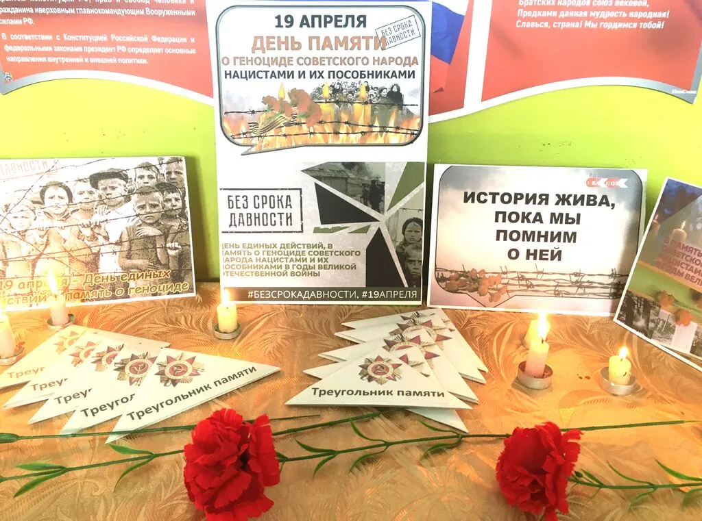К Дню памяти жертв геноцида в Индустриальном ДК работники Культуры провели акцию памяти "Без срока давности", "Это нельзя забыть", где представлены фотографии о жертвах нацизма в концлагерях, “Треугольник памяти в письмах”, красные гвоздики и почтили память жертв зажиганием свечи памяти у плаката, посвященного этому событию в истории Великой Отечественной войны 1941 - 1945гг, где звучала музыка и колокол возвещающий о гибели наших соотечественников в лагерях: мужчинах, женщинах и детях, которые погибли в мучениях. 19 апреля “Без срока давности” - история жива пока мы помним о ней.